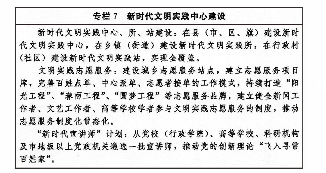 以实施文明创建工程为抓手,推动文明培育、文明实践、文明创建不断深入。创造性开展文明城市、文明村镇、文明单位、文明家庭、文明校园和未成年人思想道德建设工作先进等精神文明创建活动,拓展新时代文明实践中心建设。弘扬科学精神,深入开展爱国卫生运动,深化文明餐桌行动和“光盘行动”,倡导文明健康、绿色环保的生活方式。健全志愿服务体系,广泛开展志愿服务关爱行动。加强网络文明建设。