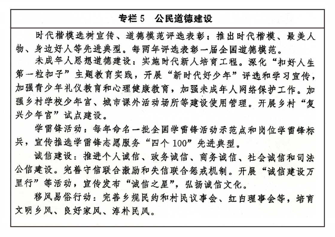 传承弘扬中华传统美德,加强社会公德、职业道德、家庭美德、个人品德建设,加强家庭、家教、家风建设。加强对革命、建设、改革时期各类先进典型的学习宣传,尊崇褒扬英雄模范,关心关爱先进典型人物。健全家庭、学校、政府、社会相结合的思想道德教育体系,把立德树人贯穿学校教育全过程。发挥优秀文化产品陶冶道德情操的作用,完善市民公约、乡规民约、学生守则、团体章程等社会规范,广泛开展弘扬时代新风行动,深化道德领域突出问题治理。加强农村思想道德建设,创新文化科技卫生“三下乡”长效机制。