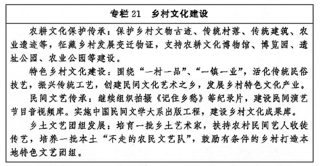 充分发挥文化传承功能,全面推进乡村文化振兴,推动乡村成为文明和谐、物心俱丰、美丽宜居的空间。加强农耕文化保护传承,支持建设村史馆,修编村史、村志,开展村情教育。把乡土特色文化融入乡村建设,留住乡情乡愁。创新支持和激励方式,将优秀文化资源转化为乡村永续发展的优质资产,推动乡村文化建设与经济社会发展良性互促。探索以志愿服务等方式,发展民间优秀文化机构、文艺团体。鼓励乡村自办文化,支持农民办自己的文化艺术节、诗歌故事会、剧团演出、书画摄影创作展等。增加乡村优秀文化产品与服务供给,推进文化结对帮扶,鼓励“三农”题材文艺创作生产,扶持具有乡土特色的文艺创作。开展“互联网+中华文明”行动计划,推进数字文化资源进乡村。探索建立乡村文化交流交易平台,活跃乡村文化市场。