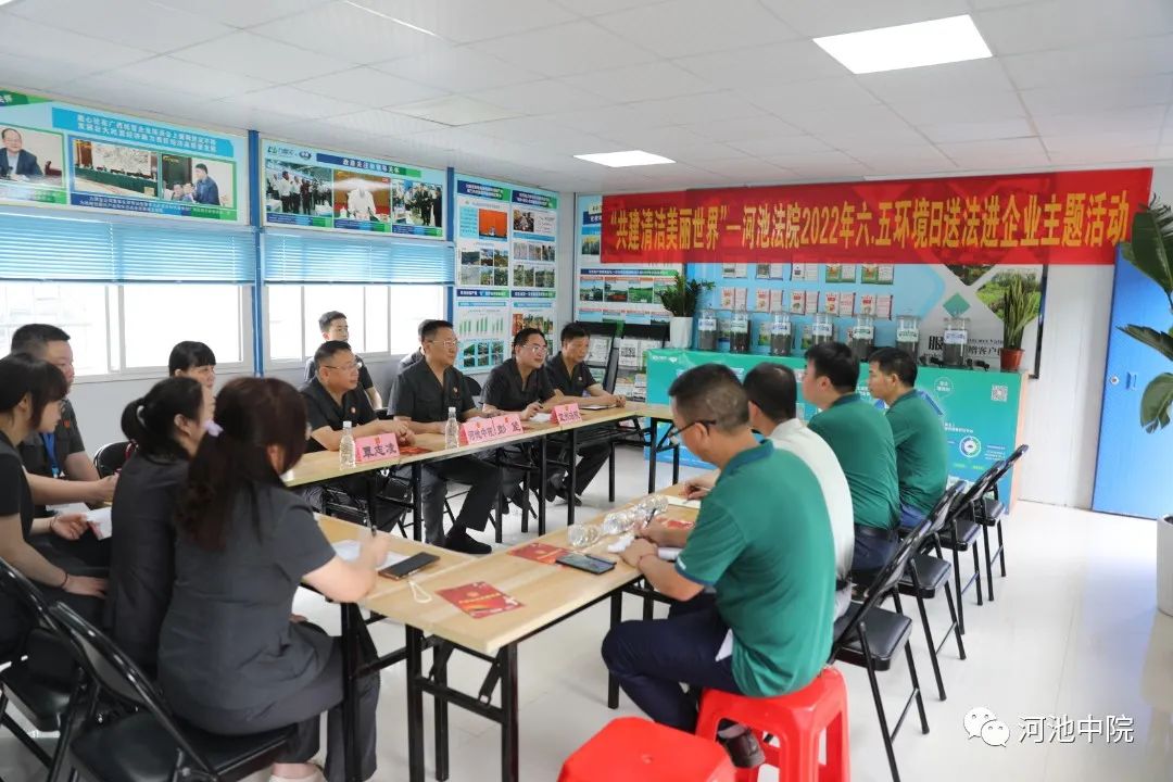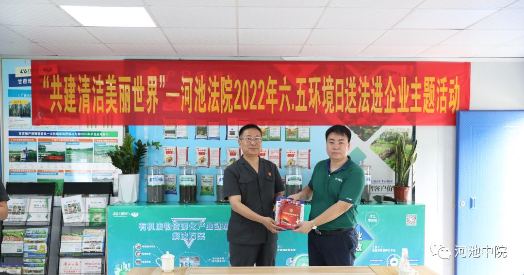 6月2日,河池中院、宜州法院组织干警走进位于宜州的广西沃泽生物科技有限公司,一同开展“共建清洁美丽世界”河池法院2022年“6.5”环境日送法进企业主题活动。