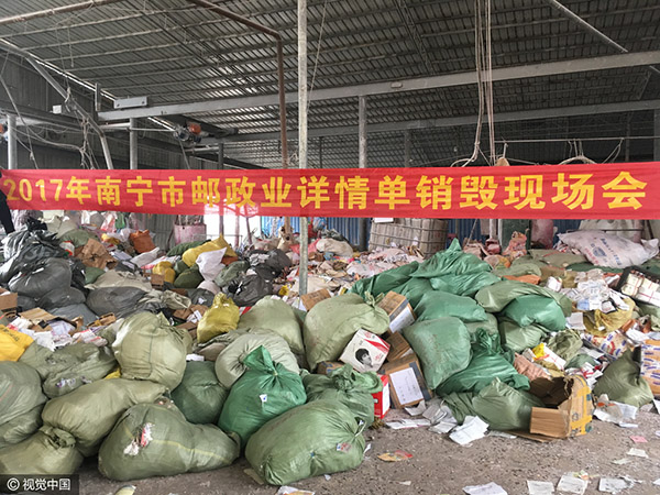 2017年3月15日上午,南宁市邮政管理局、南宁快递行业协会组织快递企业集中销毁快递详情单。这些详情单总量近3亿份,重约35吨,上面均记录有用户个人信息。图片来源:视觉中国
