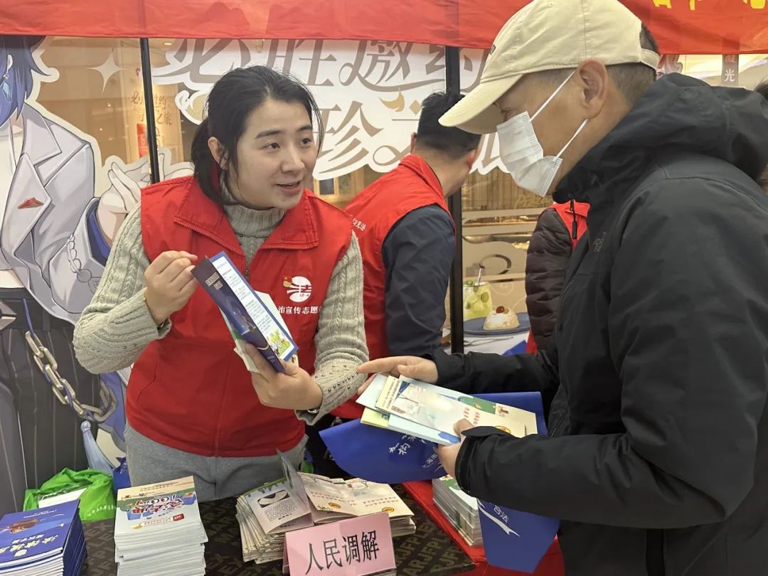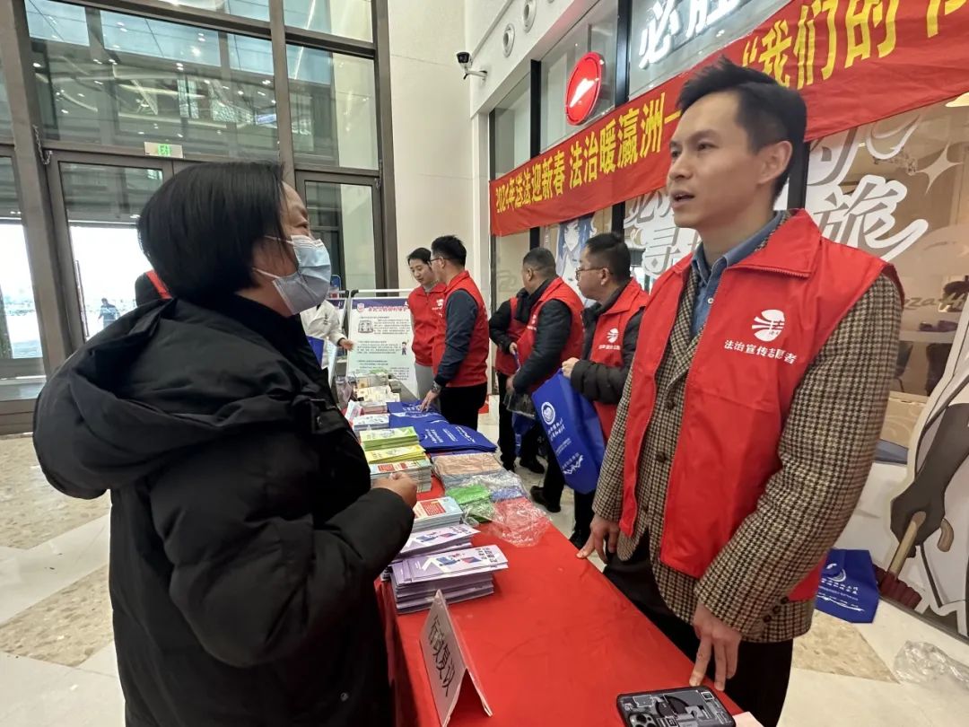 普法志愿者们在活动现场设立了法律咨询台、悬挂宣传横幅,向群众发放公共法律服务指引、《民法典100问》《法律援助维权手册》等与群众生产生活息息相关的法律资料,并提醒群众要尊法学法守法用法,自觉提高法律意识,度过一个欢乐祥和的春节。