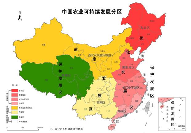 四、区域布局 针对各地农业可持续发展面临的问题,综合考虑各地农业资源承载力、环境容量、生态类型和发展基础等因素,将全国划分为优化发展区、适度发展区和保护发展区。按照因地制宜、梯次推进、分类施策的原则,确定不同区域的农业可持续发展方向和重点。