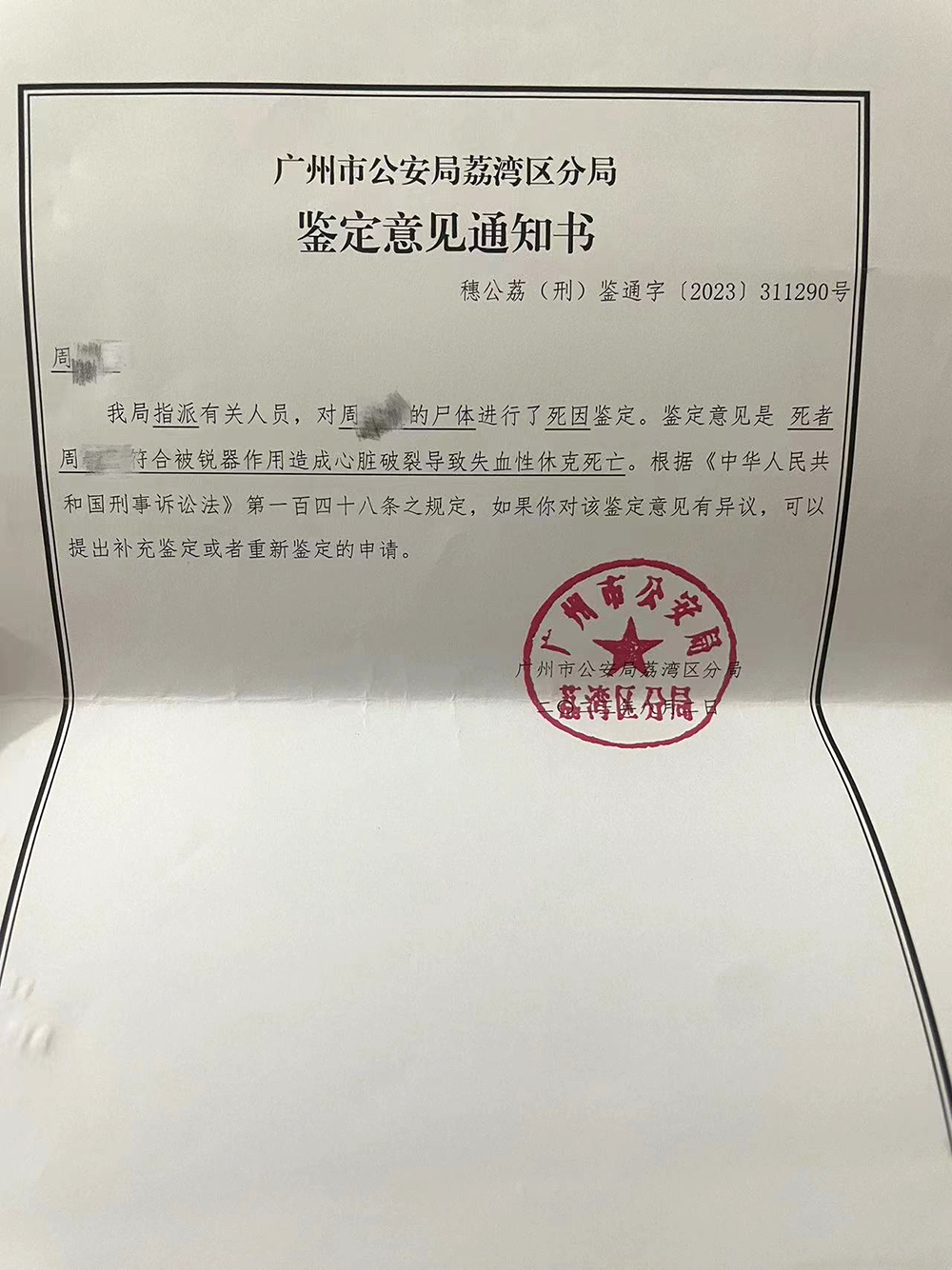 经鉴定,周雪符合钝器作用造成心脏破裂导致失血性休克死亡,该事件还导致1人轻伤、3人轻微伤。据周梅透露,当时,赵某超拿的是一把尖刀,像是可以伸缩的匕首。