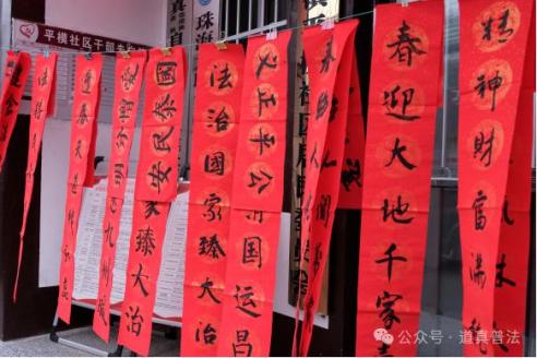 2月2日,道真自治县司法局、法宣办在平模镇开展“迎新春、送祝福、普法律、促和谐”主题法治宣传活动。普法志愿者为群众赠送法治宣传资料,细心解答群众法律咨询;书法老师挥毫泼墨,为群众现场书写法治春联,同时讲解法治春联的含义。“法治春雨润花红,正气春风吹柳绿”、“法若清风梳万物,德如化雨润千家”、“治国依法民心顺,理事照章社会安”、“尊法学法兴正气,守法用法建和谐”……一幅幅内容新颖、寓意美好、年味十足的法治春联送到群众手中,为群众增添了喜气祥和的新春气氛,将法治与文化有机结合并传递到寻常百姓家中,拉近了群众与法的距离,朴素的法治理念也将融入群众心中,伴随他们进入新的一年。此次活动,共发放民法典、宪法、法律援助、预防网络诈骗等法治宣传资料700余份,赠送法治春联300余幅。