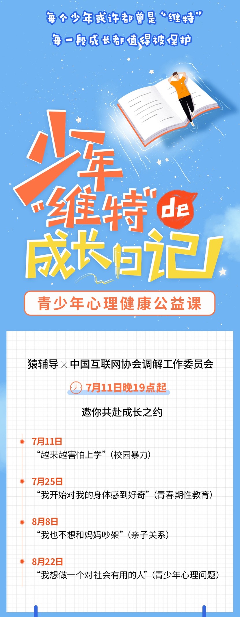 值得一提的是,为了让课程形式新颖、互动更强、更易于理解,该系列课程以少年“维特”这一主体贯穿,并以读日记的形式展开;直播期间,学生们有任何问题和想法均可在课堂上与老师实时互动交流。公益课程已在猿辅导官方微信公众号、官方微博等平台开启互动征集,同学们可以分享自己的故事,提前参与公益课互动。