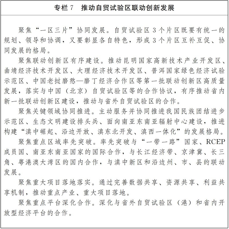 多极联动。探索“自贸试验区+联动创新区”协同发展模式,完善“自贸试验区+”联动创新的体制机制,推动自贸试验区与昆明国家高新技术产业开发区、曲靖经济技术开发区、大理经济技术开发区、普洱国家绿色经济试验示范区、中国老挝磨憨—磨丁经济合作区联动创新区项目落地,充分发挥自贸试验区与第一批5个联动创新区的双向支撑作用,不断放大自贸试验区溢出效应,推动各类特殊经济功能区优势深度叠加,功能有机融合,成果有效转化。
