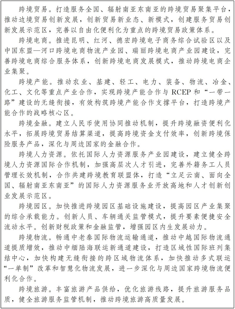 利用好云南独特的地理区位条件,推动跨境贸易、跨境电商、跨境产能、跨境金融、跨境人力资源、跨境园区、跨境物流、跨境旅游创新发展,提高与周边国家的经贸合作水平,促进边疆繁荣稳定,把云南的地理区位优势转变为经济贸易优势。