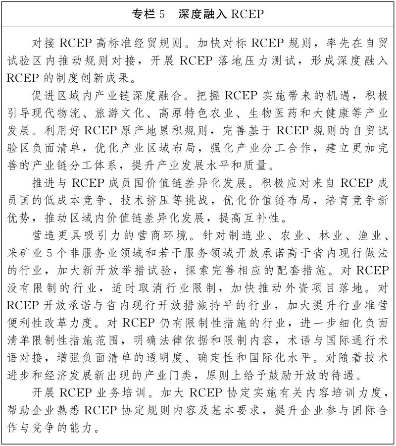 深入研究国际经贸规则发展新趋势,提升对接国际经贸新规则的综合服务水平,加快与RCEP、BIT、CPTPP等高标准国际经贸规则的对接,充分发挥自贸试验区在推动构建更高水平国际经贸规则中的示范引领作用。深入实施高质量对接RCEP行动计划,对照自贸试验区制度安排与RCEP标准的差异,聚焦RCEP协议承诺高水平开放的重点领域,探索完善服务贸易、竞争中性、环境保护、边境社会治理等领域开放合作制度。对标RCEP规则,建立更加自由便利的贸易、投资、跨境资金流动、人员进出、运输往来制度体系和更加安全有序的数据流动保障体系,将自贸试验区建设成为全面融入RCEP规则的前沿阵地、压力测试点和先行示范区。