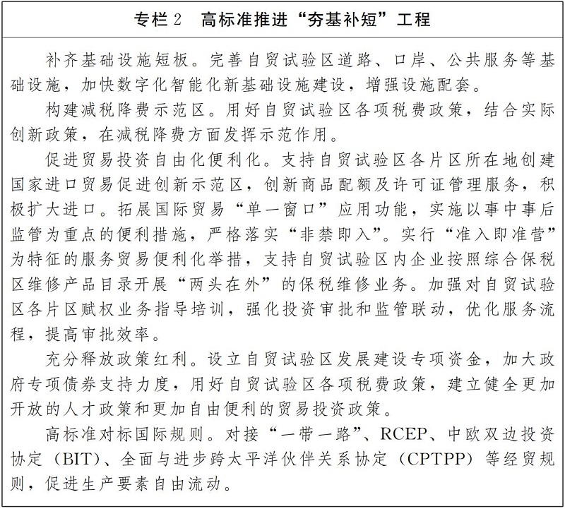 统筹推进软环境和硬环境建设,加快基础设施、公共设施建设,打造市场化法治化国际化营商环境,搭建更高水平的对外开放平台,为自贸试验区发展奠定坚实基础。