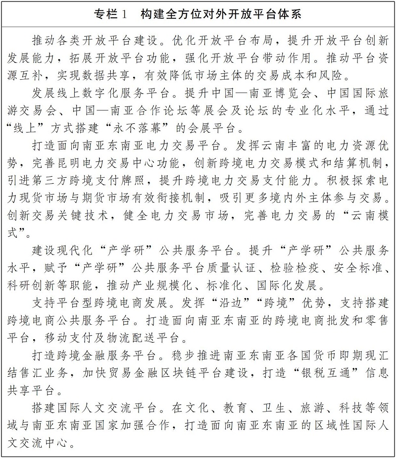 创新提升各类开放型园区平台的开放水平。提升各类国际会展、论坛的专业化服务水平,创新“云上”服务模式,打造“永不落幕”的会展平台。建设面向南亚东南亚的国际产能合作、区域电力交易、信息化综合服务平台,推动建立仿制药研发公共平台和现代化中药研发平台。抓住中老铁路开通的重大机遇,把王家营铁路场站建设成为中欧班列枢纽节点场站,发挥省级国际班列平台公司作用,推动在云南培育建设大宗货物集散中心。建设完善面向南亚东南亚的航空物流集散、特色农产品拍卖、股权交易、要素交易、跨境电子商务金融结算、数字交易,信用评级、法律服务、知识产权服务等中心,为入驻企业提供优质综合服务。