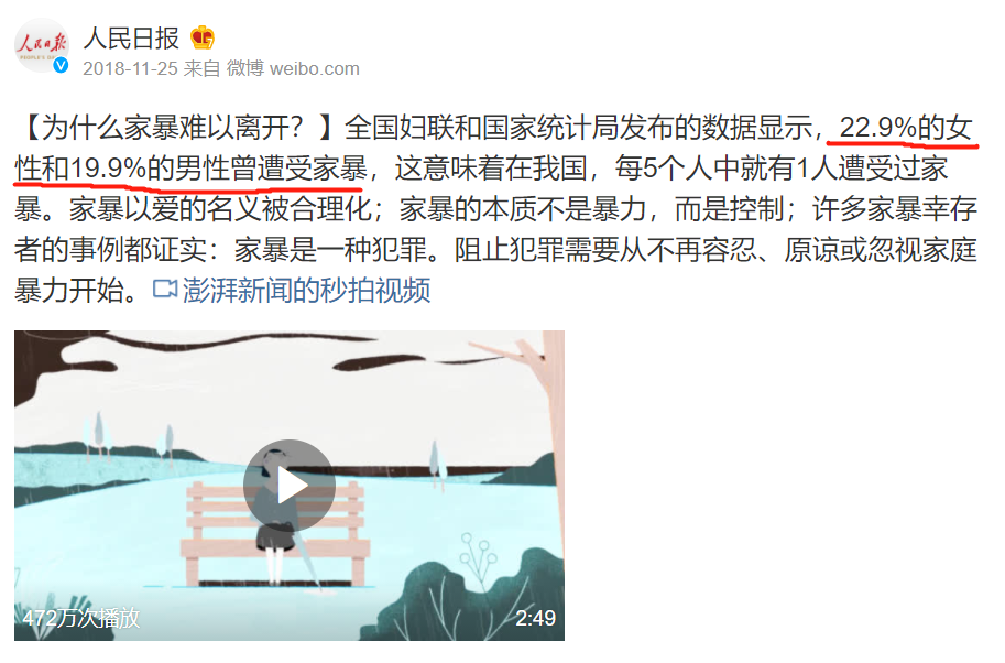全国妇联和国家统计局发布过一项统计数据,22.9%的女性和19.9%的男性曾遭受家暴,这意味着在我国,每5个人中就有1人遭受过家暴。