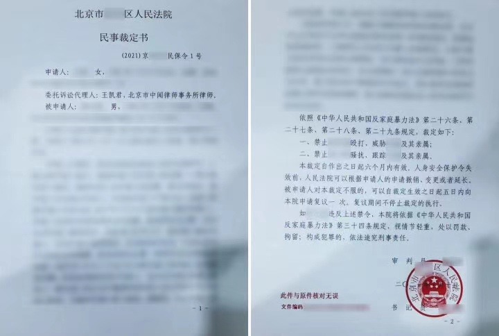 2020年10月20日,由律师代理当事人申请人身安全保护令,期间展开进一步的调查取证工作,并搜集到证明男方家暴的关键性证据材料。经过紧张、缜密的质证、谈判、辩论,2021年1月19日,我们成功帮当事人拿到法院的人身安全保护令文书,并且法院明确表态禁止男方殴打、骚扰我方当事人及其近亲属。