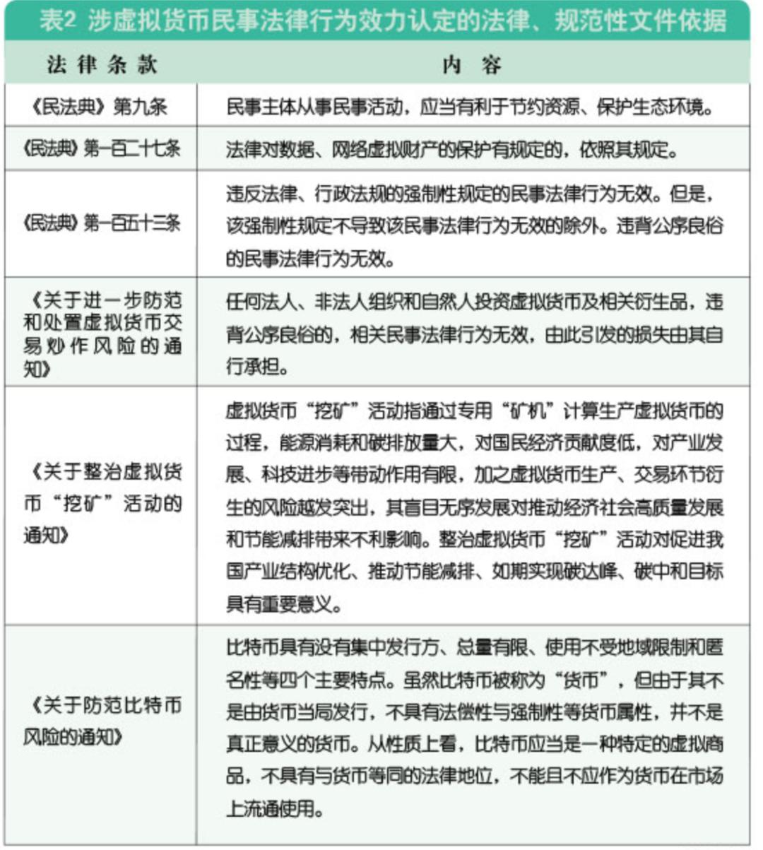 司法实践中,认定涉虚拟货币民事法律行为效力,主要依据以下法律和规范性文件条款(见表2):