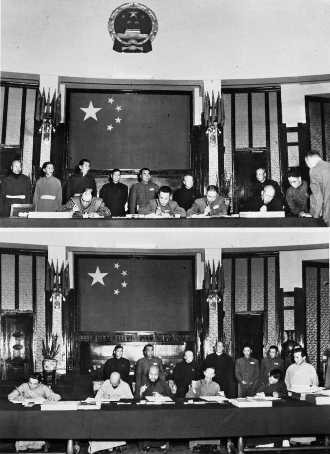 1951年5月23日,中华人民共和国中央人民政府全权代表(上图)和西藏地方政府全权代表(下图)在《关于和平解放西藏办法的协议》上签字