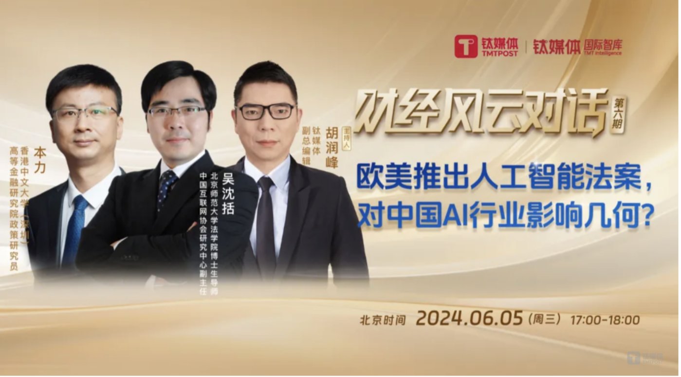 第六期《钛媒体财经风云对话》,主持人钛媒体副总编辑胡润峰,特邀北京师范大学法学院博士生导师、中国互联网协会研究中心副主任吴沈括,香港中文大学(深圳)高等金融研究院政策研究员本力来共同探讨人工智能发展与治理的问题。