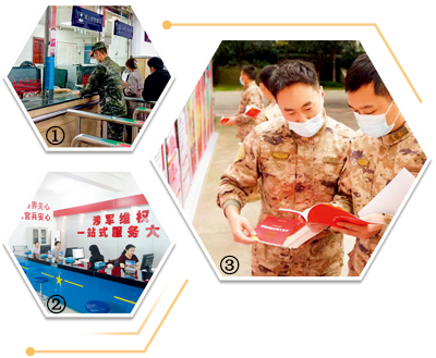 图①:陕西省西安汽车站设置军人依法优先窗口,保障官兵出行。王少伟 摄;图②:河南省新县涉军维权一站式服务大厅。柴代亮 摄;图③:成都军事法院组成“巴蜀军营普法讲师团”,深入部队开展宪法宣传。余飞 摄