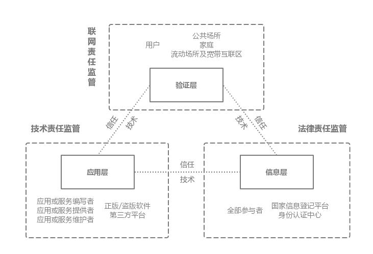 为什么互联网的身份一直是法律监管的盲区,在技术层面有三点原因可以说明:首先,在验证层,网民的互联网身份认证,各类公共场所(例如网吧)已经全面可控。个人应用领域中,家庭用户也算是已认证范围之内的身份。但是,流动的WIFI领域,以及宽带互联部分,这一部分仍是监管盲区,因为不知道联网的人是谁。其次是应用层,软件应用产品及内容越来越多,不管是PC机还是手机,都已经成为软件的集成体。这些存在大量的盗版软件和未实名认证的应用的现象背后,是监管的黑色区域。最后,在信息层的现实问题在于大量国际域名不在国内的监管范围之内。同时,国内网站的备案(国家登记)中,个人备案的非常多,大量的个人备案信息是虚假的。解决互联网可信身份问题,科学对待区块链技术带来的法律效应,亟待构建互联网可信身份责任模型,量化划分监管职权。