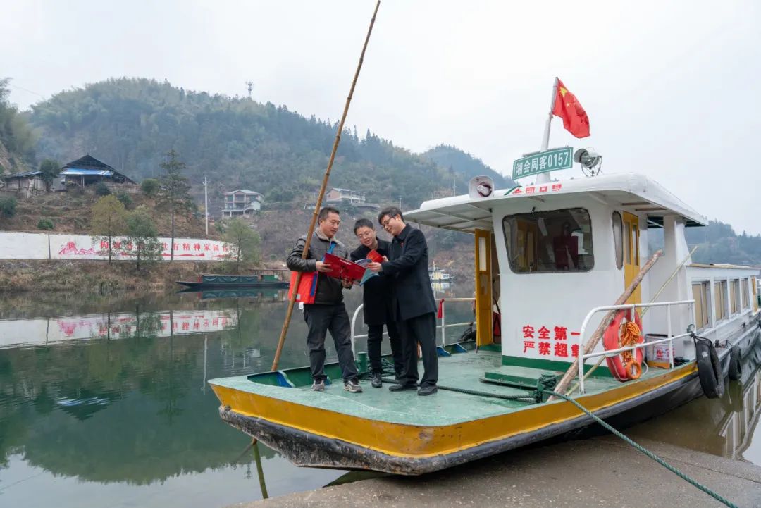 图③:坐渡船中,法院干警在船上“就地普法”。