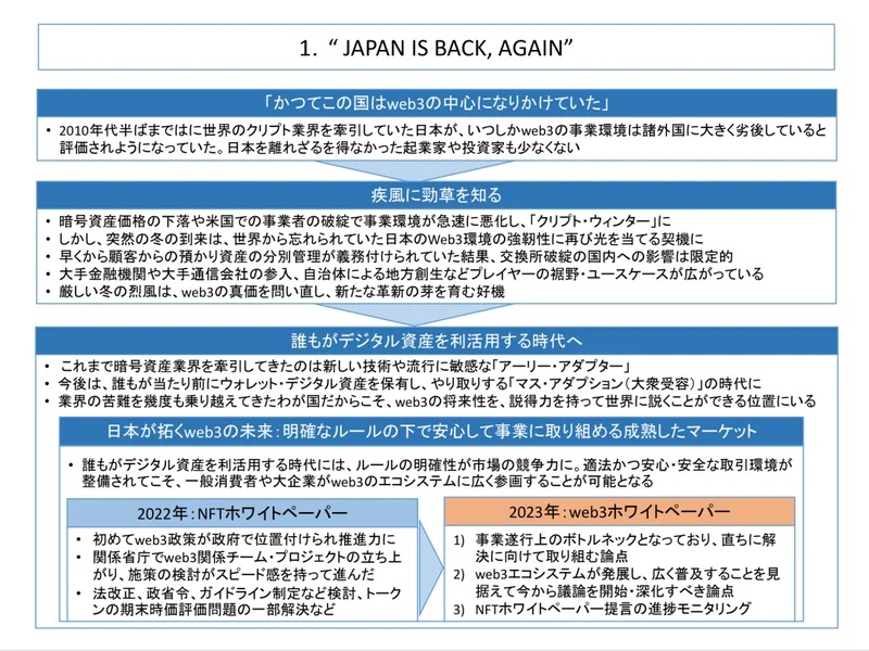 白皮书打出口号“日本又回来了”,建议日本应该在今年的七国集团(G7)峰会上展示领导力,届时将讨论加密货币问题,并建议日本应该着眼于Web 3.0的发展潜力,并明确其在技术中立和负责任创新方面的领先地位。