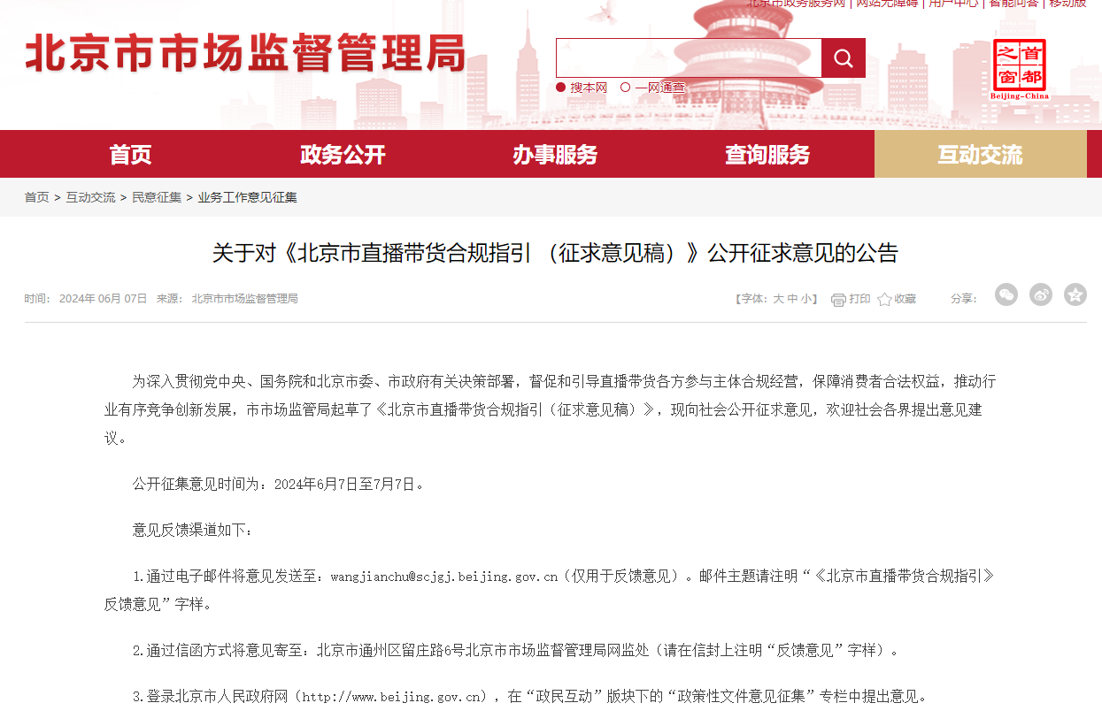 北京市市场监管局官网显示,该《征求意见稿》的公开征集意见截止日期为7月7日,社会各界可通过电子邮件、信函等方式提出意见建议。