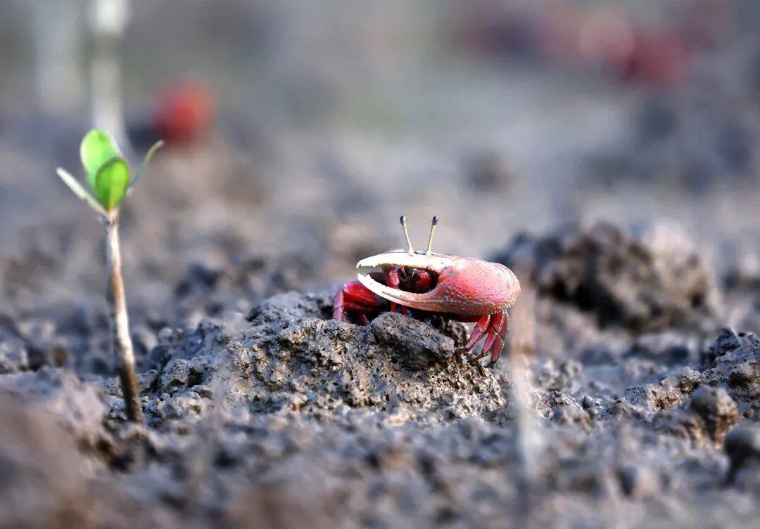 大潮落下,招潮蟹挥舞着大螯,爬出洞穴。