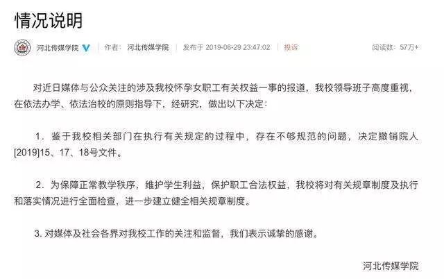 6月28日一早,河北传媒学院的教职员工通过工作微信群,收到了河北传媒学院院长办公室印发的《关于学校计划生育报备制度执行情况的通报》,以及对部分员工的处罚公告。《通告》指出,对未报备怀孕女职工进行“全校通报批评,扣发6个月绩效工资”,“取消两年内评优评先和评定职称”。
