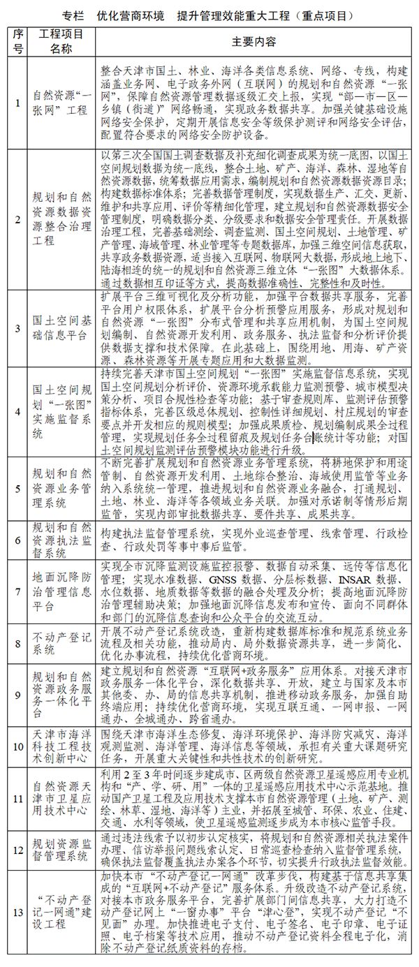 资源保障支撑能力不断提升,重点领域项目顺利推进。推进“一制三化”审批制度改革,营商环境不断优化。加大“补短板”用地支持力度,提高供给体系质量效益。保障约500所民办幼儿园、10所医院、1座市级公共图书馆、1座群众艺术馆、27座区级公共图书馆、86.6万套保障型住房、147万平方米棚户区改造、8624万平方米老旧小区改造等一批民生工程顺利落地。国家海洋博物馆建成并运行,累计接待超166万人次。支撑京滨、京唐、津兴铁路开工建设,开展津潍铁路(京沪高铁二通道)、津承城际前期工作。推动“1001工程”电力项目、中俄天然气管道、天津滨海国际机场T3航站楼等重点工程规划建设实施。