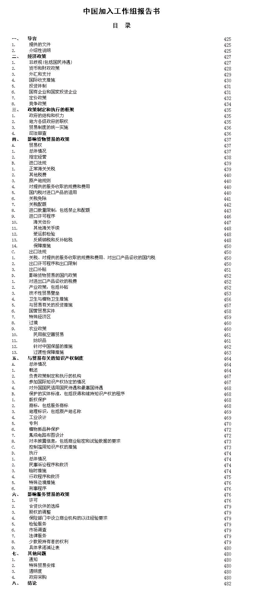 1.   在1987年3月4日的会议上,理事会设立了工作组,以审议中华人民共和国(“中国”)政府关于恢复其GATT缔约方地位的请求(文件号L/6017,1986年7月10日递交),并向理事会提交建议,其中可包括关于中国地位的议定书(草案)。在1995年12月7日的信函中,中国政府申请根据《马拉喀什建立世界贸易组织协定》(“《WTO协定》”)第12条加入该协定。按照中国的申请并根据总理事会1995年1月31日的决定,原中国GATT1947缔约方地位工作组自1995年12月7日起转为中国加入WTO工作组。工作组的职权范围和成员组成载入WT/ACC/CHN/2/Rev.11和Corr.1号文件。