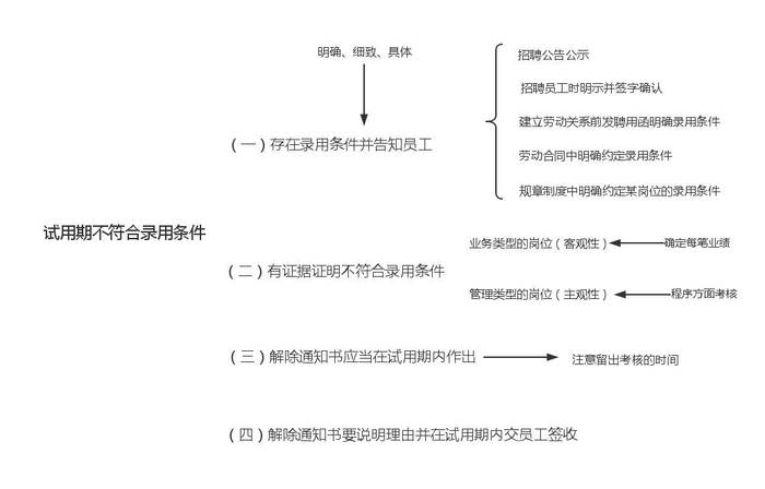企业在试用期运用《劳动合同法》第39条合法的解除劳动合同除了有明确具体经过公示的录用条件外,必须符合下面四个法律要件:第一企业存在录用条件(这点在之前已经谈到了)并告知员工;第二有证据证明符合不符合录用条件,这点也必须提醒企业注意收集保留证据,如果有了明确具体的录用条件,收集固定这部分证据就相对容易一些,对于一些业务类型的岗位,可以通过业绩来约定录用条件,对于管理类型的岗位,可以从程序方面进行考核,确定录用条件;第三企业解除通知书应当在试用期内做出;第四解除通知书要说明理由并在试用期交由员工签收。