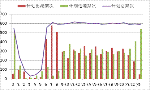 图1.首都机场2014年夏秋季某日各时段航班进出港情况