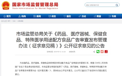 《药品、医疗器械、保健食品、特殊医学用途配方食品广告审查管理办法 (征求意见稿)》再次公开征求意见