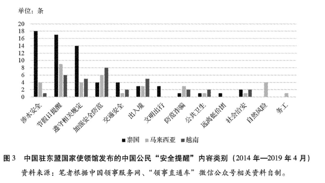第二类是通过分析中国公民海外安全改进中国领事工作,研究内容包括两个方面:一是围绕不同国别和区域的中国公民安全展开研究;二是围绕不同群体的海外中国公民安全展开研究。但这两方面涉及东盟国家的研究成果屈指可数。前者代表性成果包括:许彤辉、陈奕平以泰国普吉岛沉船事件为基础,通过梳理中央及部委、地方政府、中国驻外使馆、华助中心、民间组织与企业等五个层面对海外中国公民的救助过程和机制,评析了海外中国公民权益保护机制呈现出的特点与不足之处;卢文刚、魏甜基于抗灾能力和脆弱性的公共安全评估框架对东盟十国中国公民遭遇的旅游安全风险、企业安全风险和恐怖袭击等三种公共安全风险事件进行评估,并从参与机制、信息建设、组织建设等方面就相应的风险治理与安全保护提出建议;卢文刚、黎舒菡梳理了2014年东南亚地区中国公民遭遇的主要安全事件,从法律、组织架构、实施内容、人力、经费保障等五个方面探析了该地区中国领事保护工作存在的问题及改进方法。后者代表性成果包括:黎海波以2008年中国撤离滞留泰国游客这一建国以来最大规模的海外游客撤离行动为例,探讨了中国领事保护的运作机制及其发展趋势。潘玥通过梳理印尼爆发的多次中国劳工争议,从经济、政治、制度和国际等四个方面,分析了引发争议的深层原因,并从政府、企业、学术层面对规避劳工风险提出对策。