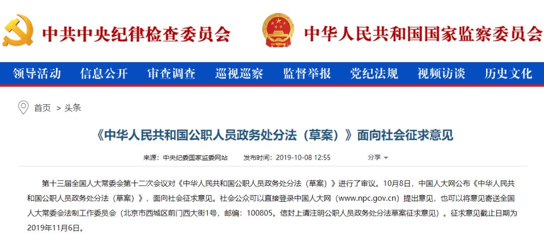 《中华人民共和国公职人员政务处分法(草案)》公开征求意见