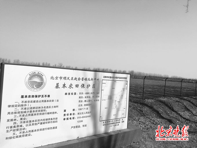 记者跟随张先生来到了顺义赵全营镇白庙村边。路边是一眼望不到头的农田,虽然土地里没有任何农作物,但是路边就竖立着“基本农田保护区”的告示牌。张先生的岳父母看好的生态农家院就建在这片土地之上。