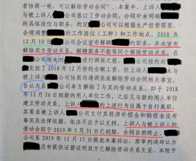 2、二审法院认定,山矿公司于2018年12月10日“宣布解聘王甲的职务,并未宣布解除双方劳动关系”;而王甲却自认为山矿公司与其解除了劳动关系,之后到新的用人单位工作并与新的用人单位订立劳动合同,二审法院将这些行为笼统认定为“自行离职”。