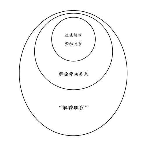 总结而言,二者在概念范围上是包含关系,在概念结构上是递进关系。解除劳动关系与违法解除劳动关系这两个法律概念,同样也是范围包含和结构递进的关系。在概念范围上,“解聘职务”包含着“解除劳动关系”,而“解除劳动关系”又包含着“违法解除劳动关系”(见示意图1)。