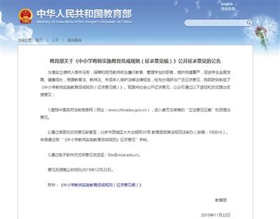 昨日,教育部发布《中小学教师实施教育惩戒规则(征求意见稿)》,截止时间为12月22日。官网截图