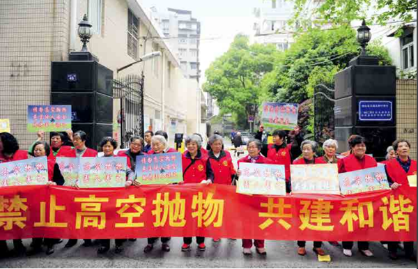图为在武汉汉口台北路街头,几十名志愿者举着标语呼吁民众,勿高空抛物,还大家一个”头顶“上的安全。摄影/中新社记者 张 畅
