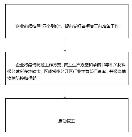 在省突发公共卫生事件一级响应解除前,企业应最大程度动员外地员工不要返常,减少人员流动,复工企业必须按照“四个到位”,提前做好各项复工前准备工作。复工前,企业须将疫情防控工作方案、复工生产方案和承诺书等相关材料报经营所在地辖市、区或常州经开区行业主管部门备案,并报当地疫情防控指挥部,方可启动复工。