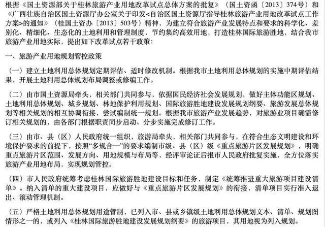 2014年桂林市政府印发《桂林旅游产业用地改革试点若干政策 (试行)》,提出强化旅游产业用地规划管控制度,探索旅游产业用地分类管理政策,探索农民利用集体土地参与旅游开发分享收益的模 式等措施,曾在学界业界引发广泛讨论。