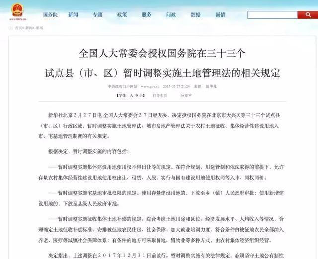 2015年2月全国人大常委会通过授权决定,正式授权国务院在33个试点县行政区域内暂停实施土地管理法的5个条款、城市房地产管理法的1个条款。