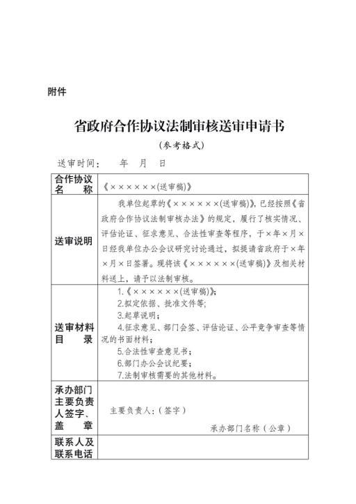 为了规范省政府合作协议的法制审核工作,经省政府同意,现将《省政府合作协议法制审核办法》印发给你们,请遵照执行。