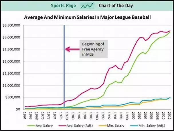 ↓通过此图可以清晰地看出,在自由球员出现之后,MLB的薪水也迅速走高