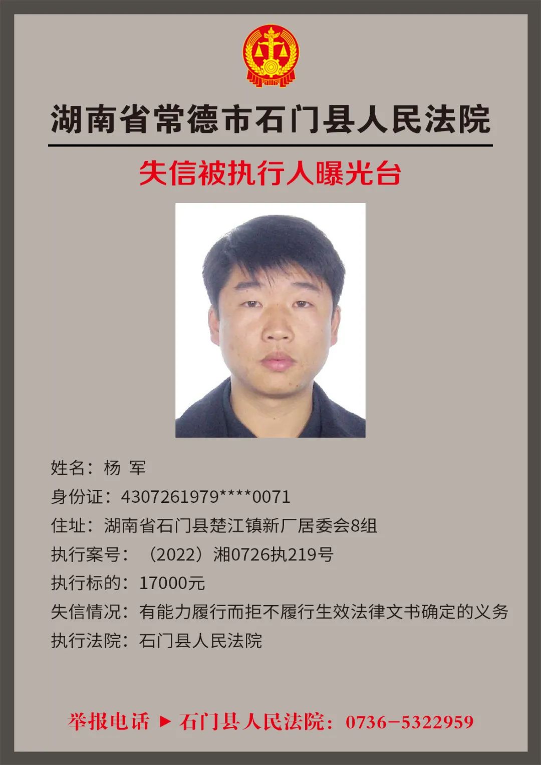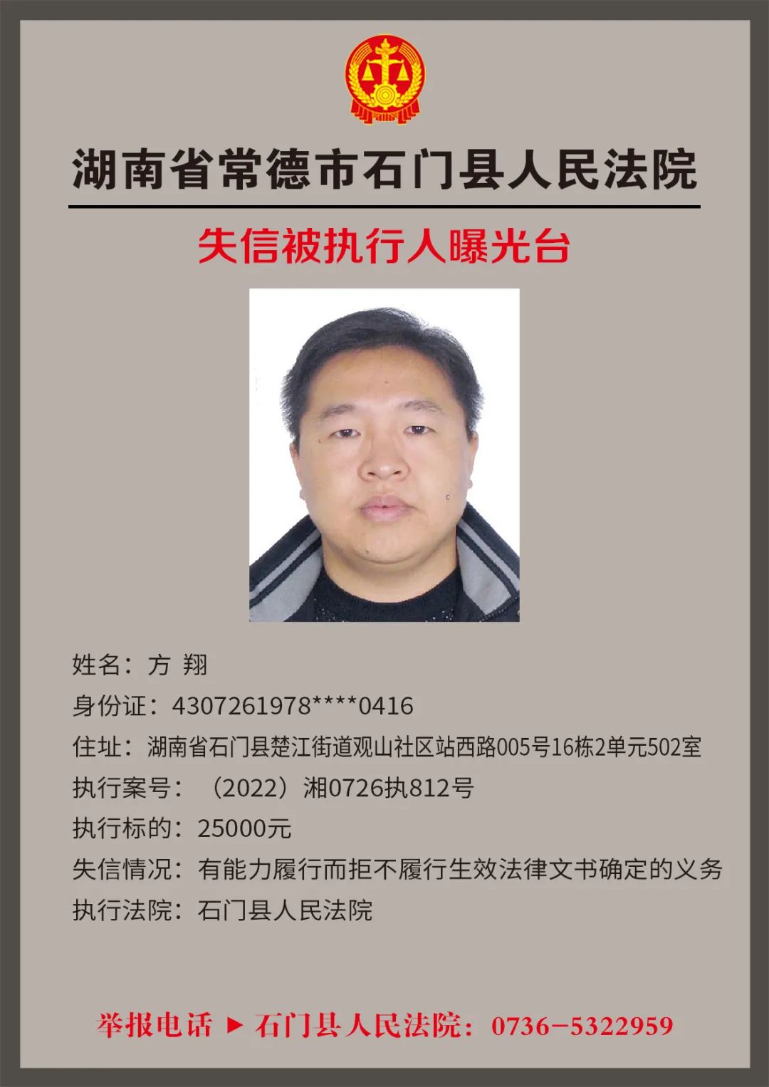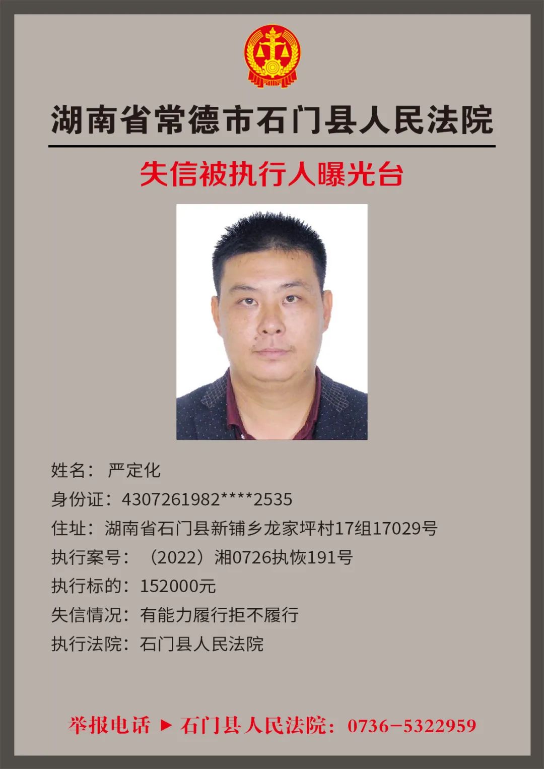 为推进社会诚信体系建设,营造惩戒失信、褒奖诚信的社会氛围,创造稳定、公平、透明、可预期的营商环境,根据《最高人民法院关于公布失信被执行人名单信息的若干规定》,石门法院会相继发布失信被执行人名单,本次为2022年第四轮曝光的失信被执行人,旨在加强对失信被执行人信用监督、威慑和惩戒。