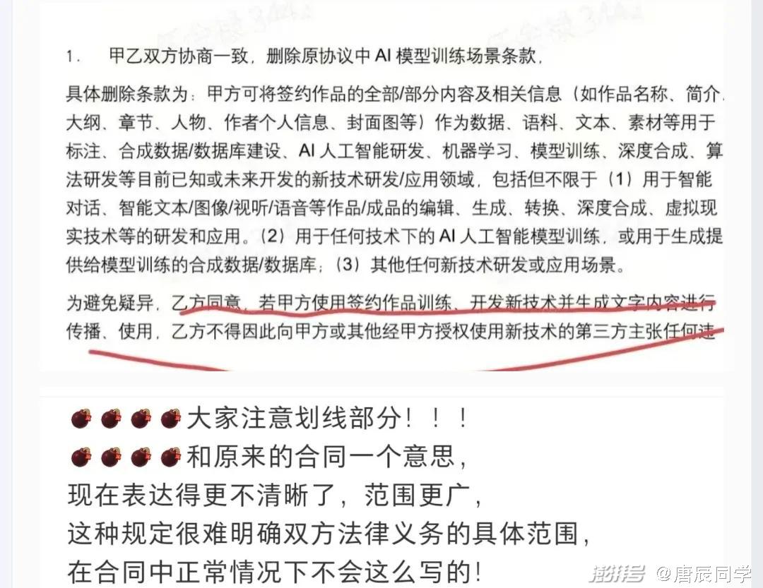 实际上,早在2023年,就有作者在番茄小说的签约协议中,发现涉及AI训练的条款。当时并没有被作者和业界广泛关注。这次拿“作者小说训练AI”事件之所以发酵,主要还是番茄小说的吃相过于难看,更多作者选择停更、断更和在社交平台发声抗议,来和平台博弈、维权,要求解除AI协议。