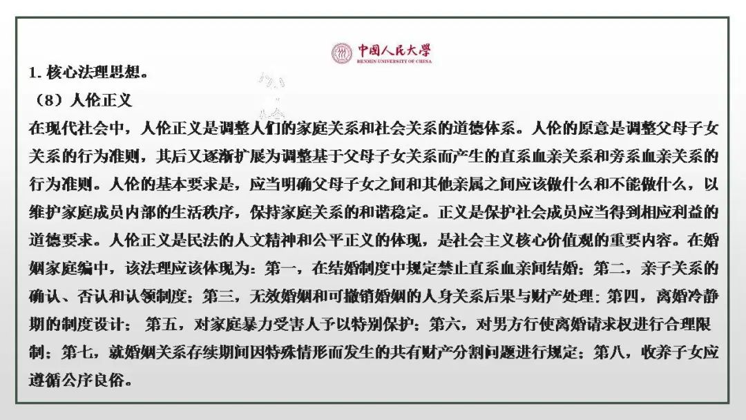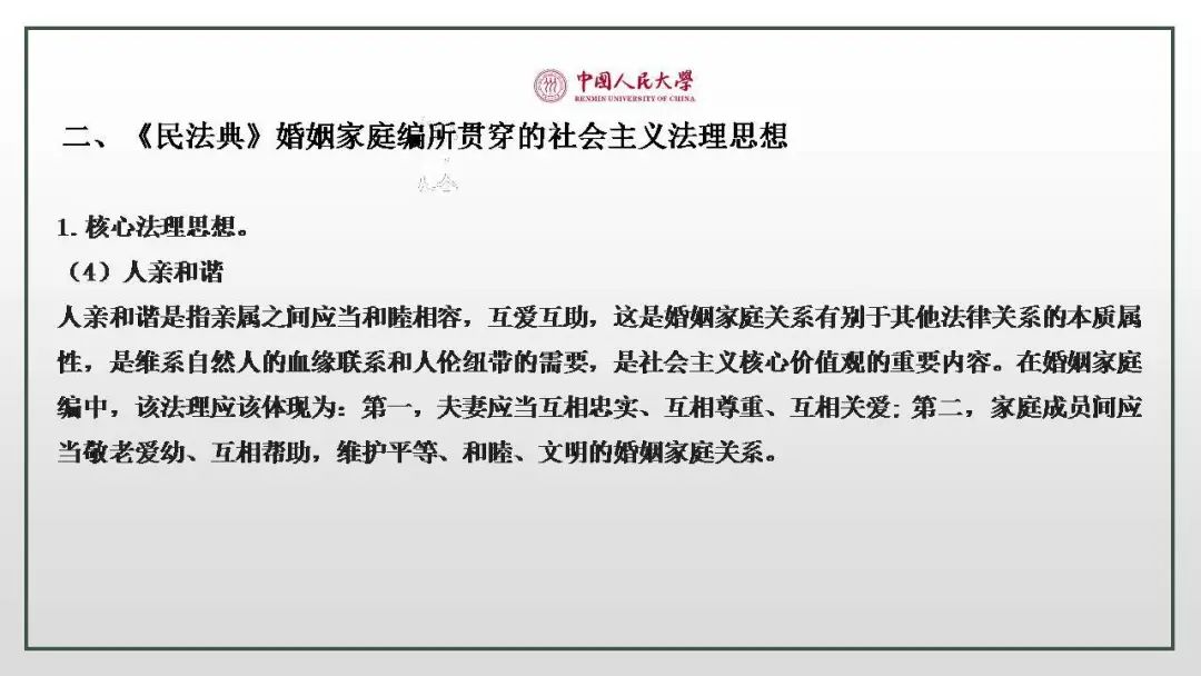 婚姻家庭编的具体法理体现为以下几点:第一,权利法定,体现为婚姻家庭成员的权利受国家保护;第二,契约维护,体现为婚姻家庭范围内的意思自治,例如,收养成立的自愿,约定财产制的设立等;第三,行为公示,强调对婚姻家庭行为的社会认同,例如,结婚和离婚的登记,收养关系成立、解除的登记等;第四,效力公信,规定婚姻家庭行为的对外效力,例如,规定夫妻之间的家事代理权等;第五,人身利益优先,体现为婚姻家庭关系的人权平等、人身自由、人格尊严、人伦正义的内涵;第六,财产权利公平,规定婚姻家庭成员的各项财产权利,以保障婚姻家庭各项功能的实现;第七,平等、文明、和谐,婚姻家庭编的一切制度设计和规则实施,均应服务于促进婚姻家庭关系的健康良性循环这一目的;第八,禁止权利滥用,婚姻家庭成员在行使婚姻家庭权利时,应当自觉维护公序良俗,防止因滥用权利而损害他人权益和社会公共利益。