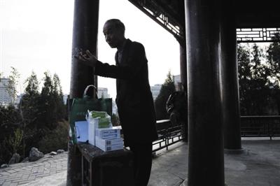 ????2014年11月24日,北京东单公园,已进行多年防艾志愿工作的老彭,像往常一样把安全套、艾滋病检测试剂整齐码放后,就开始跟大家聊起艾滋病防治话题,提醒大家避免高危性行为。图/CFP