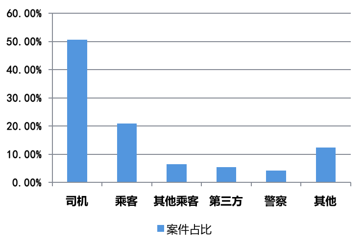 公交车司乘纠纷案件中,50.54%受害人为司机,乘客占20.97%,其他乘客占6.45%,第三方为5.38%,民警占4.30%。