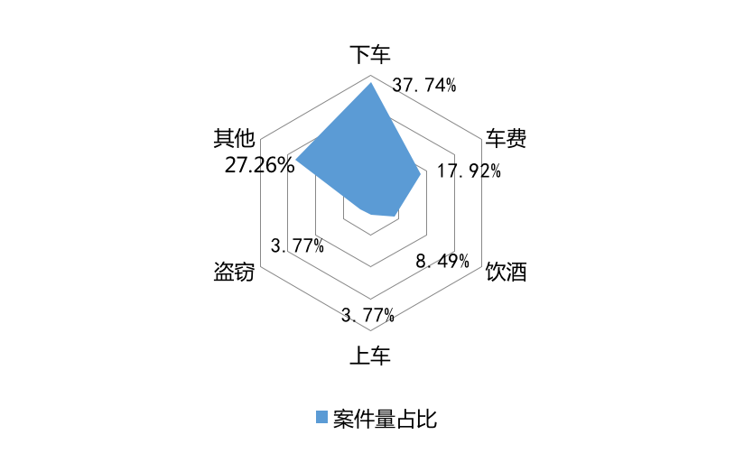 从司乘纠纷起因分析,多为车费、上下车地点等“一言不合”的小事,合计占比近六成。案件量靠前的各类纠纷起因及占比分别为:下车(37.74%),车费(17.92%),饮酒或吸毒(8.49%),上车(3.77%),盗窃(3.77%),其他(27.26%)。